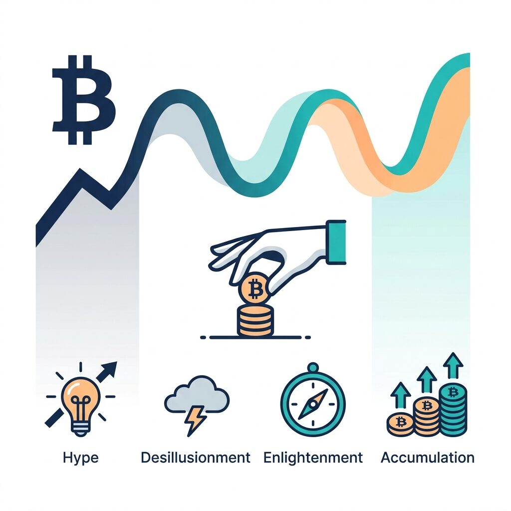 Ako môžete vidieť na grafe nižšie, trhové cykly sa historicky delia na štyri jasné fázy: